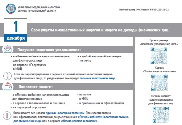 В ближайшее время гражданам, имеющим в собственности жилые дома, квартиры, транспортные средства, земельные участки, будут направлены налоговые уведомления на уплату имущественных налогов, а также НДФЛ за 2024 год. Срок уплаты налогов – не позднее 1 декабря 2025 года включительно. Если не уплатить налог вовремя, со 2 декабря будут начисляться пени.